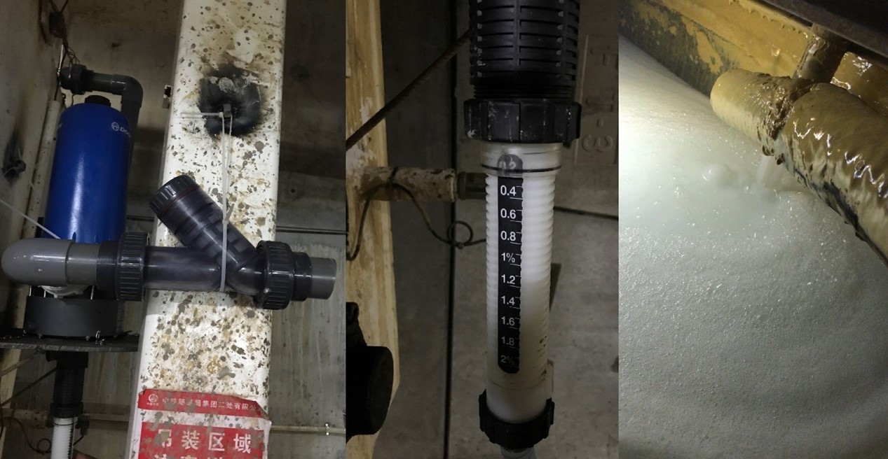 首先项目部配合对膨润土箱进行改造,加装高分子聚合物物料稀释泵,现场视实际推进出渣效果调整聚合物稀释液浓度(0.2–2%),浓度越高,越能在富水地层中起到改善出渣渗水量的效果。